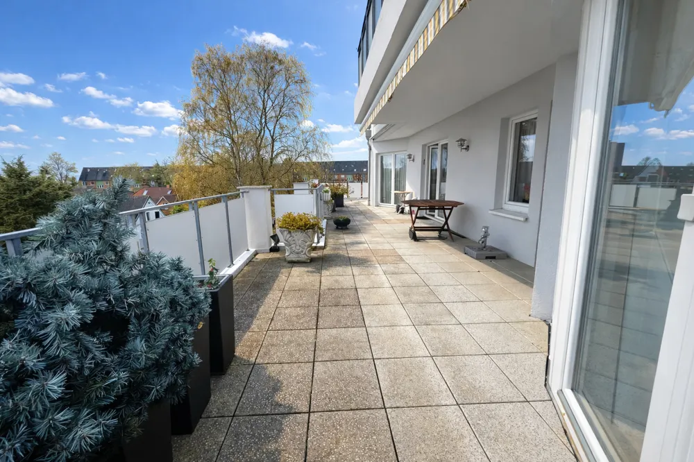 Der beeindruckende Wohn‑ und Essbereich mit über 60 m² bildet das Zentrum der Wohnung. Große Fensterflächen sorgen für optimale Belichtung und schaffen eine helle, einladende Atmosphäre. Von hier aus gelangen Sie direkt auf die ca. 46 m² große Süd/West‑Terrasse. Eine elektrisch betriebene Markise sorgt für angenehme Beschattung.