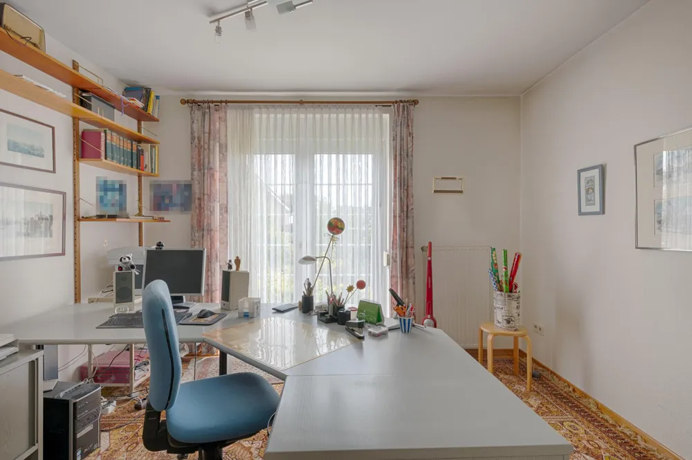 Betreten Sie das Erdgeschoss und lassen Sie sich von dem warmen Ambiente des Stäbchenparketts und der offenen Steintreppe empfangen, welche sowohl in den Keller, als auch in das Obergeschoss führt. Das offen gestaltete Wohnzimmer mit einem praktischen Raumtrenner zum Esszimmer, bietet viel Platz für einen erholsamen Abend mit Blick in den Garten. Der Erker im Esszimmer sorgt für viel natürliches Licht, während Außenjalousien Privatsphäre bieten. Zwei Zimmer bieten Raum für Schlafzimmer und/oder das Büro. Eine Einbauküche sowie ein Gäste-WC und ein Badezimmer mit Dusche runden das Erdgeschoss ab.