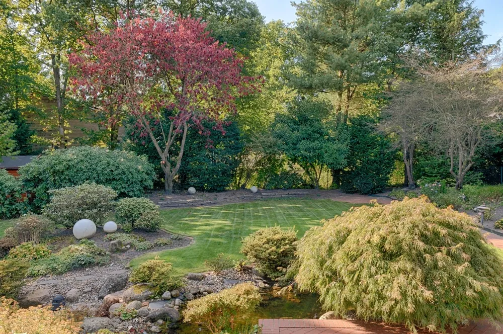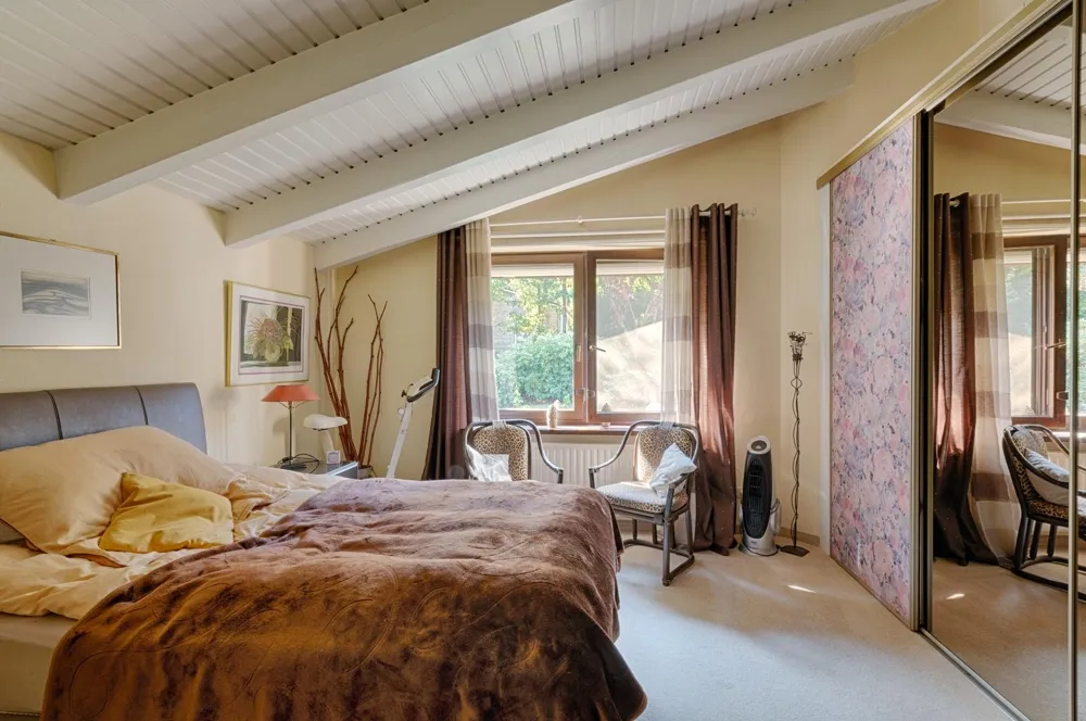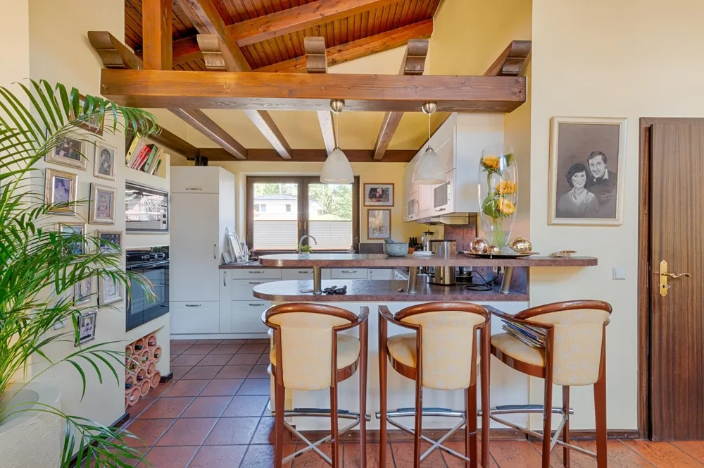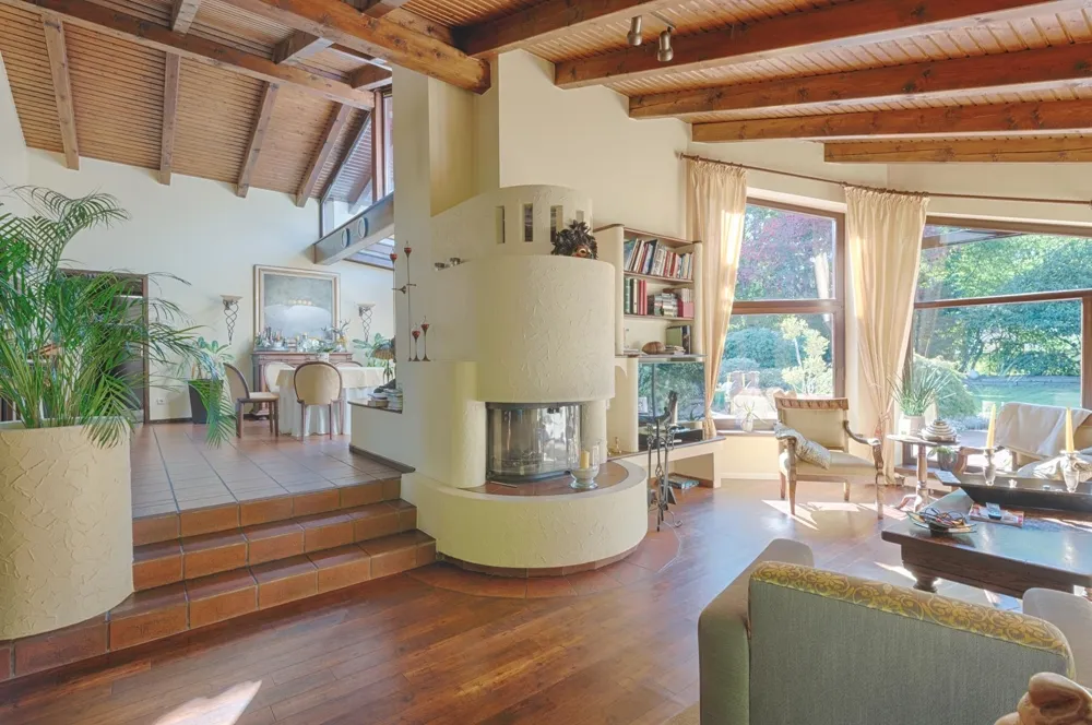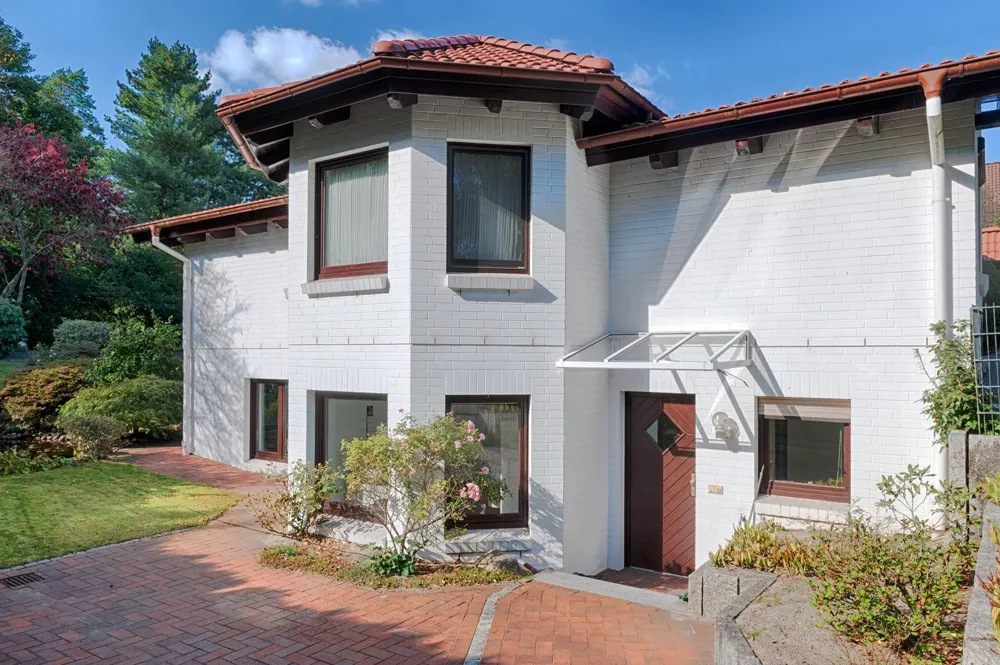 Die Fassade aus weiß geschlemmtem Kalksandstein und das rote Pfannendach verleihen dem Objekt einen klassischen und zugleich modernen Charakter. Das ca. 1.375 m² große Grundstück ist liebevoll und kreativ gestaltet – inklusive idyllischem Gartenteich und großzügiger Terrasse mit Überdachung als Holz-/Glaskonstruktion und elektrischer Markise.