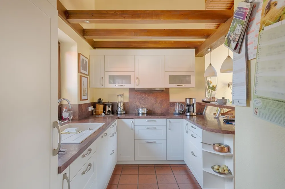 - Moderne Küche (Einbau 2017) mit Esstresen und angrenzendem Hauswirtschaftsraum