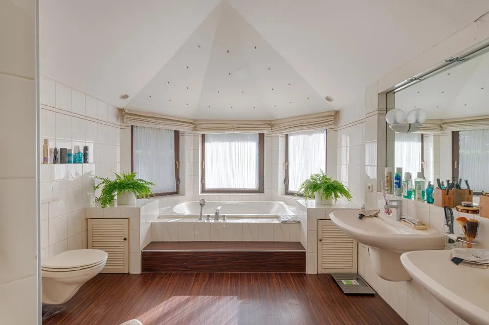 - Helles, großes zeitloses Badezimmer mit Wanne, Dusche und 2 Waschbecken