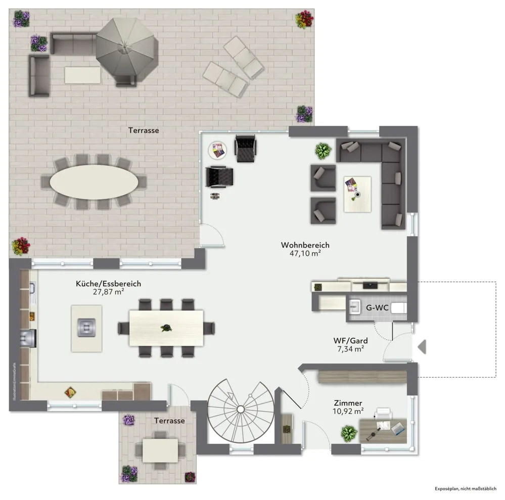 - Außenterrassen mit Betonplatte mit Schieferstruktur - anthrazit - und/oder Bankirai (Edelholz/Hartholz)