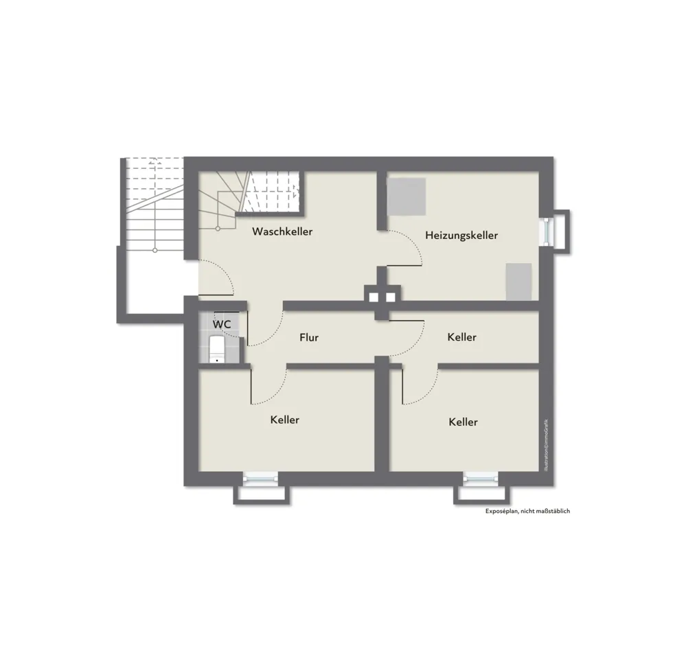 Die Raumaufteilung umfasst fünf Zimmer mit ausgebautem Dachgeschoss. Der Keller ist auch über einen separaten Außenzugang erreichbar