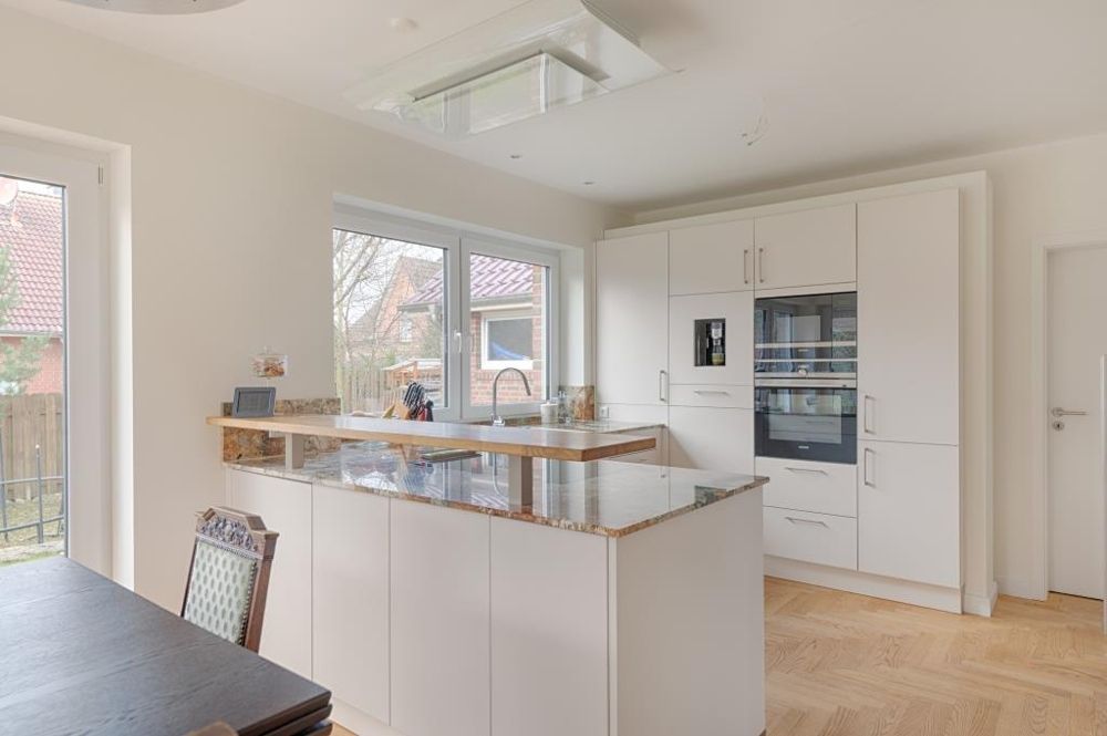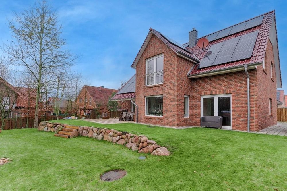 Dieses modern gestaltete Einfamilienhaus aus dem Jahr 2021 vereint hochwertige Bauweise, stilvolles Ambiente und durchdachte Funktionalität auf ca. 167 m² Wohnfläche. Der massiv errichtete Baukörper – ergänzt um einen klassischen Kapitänsgiebel und einen Dachstuhl in Holzbalkenkonstruktion – vermittelt bereits von außen einen wertigen und zeitlosen Eindruck. Dank energieeffizienter Bauweise gemäß KfW-55-Standard präsentiert sich das Objekt zudem als zukunftsorientiertes und kostensparendes Zuhause. Großzügige Fensterflächen lassen viel Licht ins Innere und schaffen ein offenes Wohngefühl.