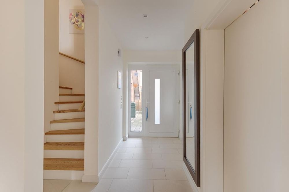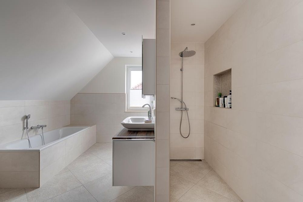 Im Erdgeschoss wurden Fliesen in Eingangsbereich, Hauswirtschaftsraum, Gäste-WC und Garderobe verlegt, während sämtliche übrigen Räume mit edlem Fischgrätenparkett aus Roteiche in Vollstab-Ausführung ausgestattet wurden. Im Obergeschoss setzt sich die hochwertige Optik mit Vollstab-Roteiche im Schiffsboden-Stil fort; das Vollbad ist vollständig gefliest. Beide Geschosse werden über die Fußbodenheizung beheizt.
