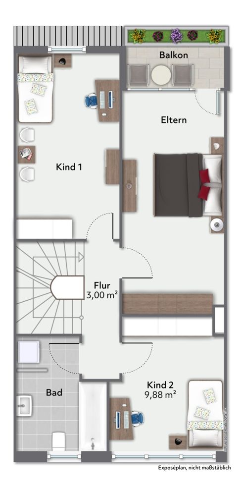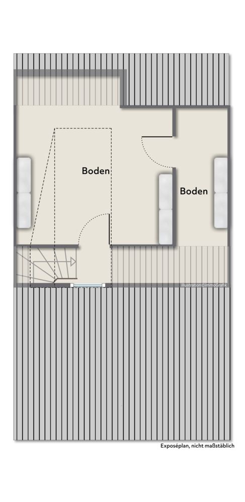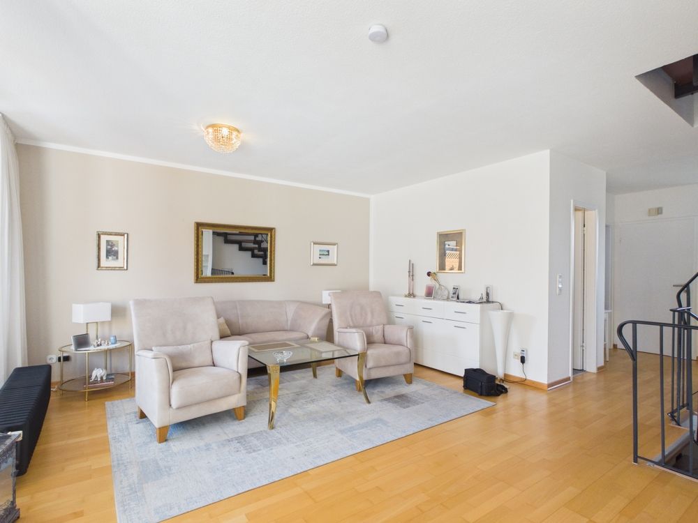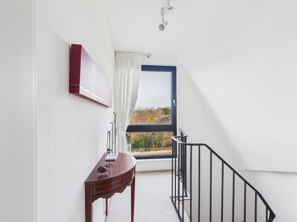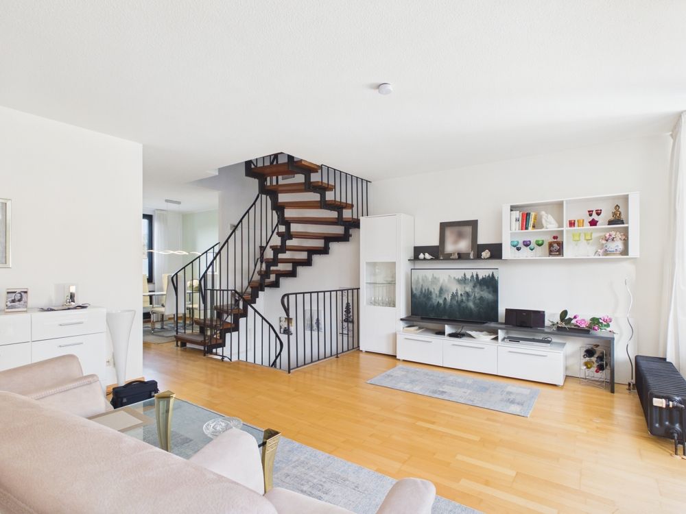 Die Böden sind mit pflegeleichten Laminatbelägen versehen, die den Wohnräumen eine warme und moderne Optik verleihen. Eine stilvolle Stahltreppe mit Holzstufen verbindet die Etagen und setzt einen architektonischen Akzent.
