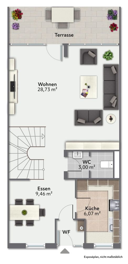 Der Außenbereich bietet eine ca. 15 m² große Terrasse mit Markise – ideal für entspannte Stunden im Freien. Ergänzt wird das Angebot durch einen Balkon mit ca. 5 m² im Obergeschoss.