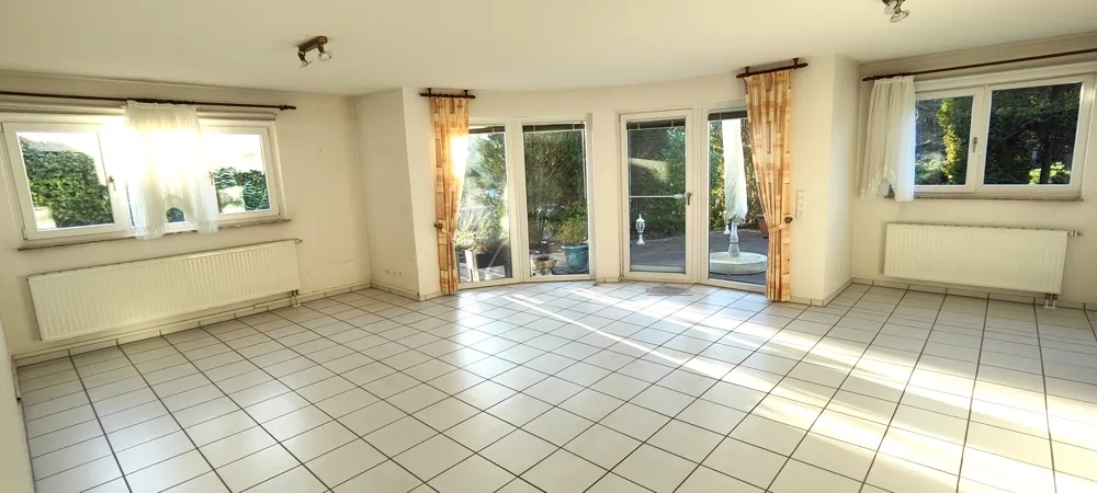 Der durchgängig mit weißen Fliesen belegte Wohnbereich besticht durch seine großzügige Raumgestaltung und die bodentiefen Fenster, die viel Tageslicht ins Innere lassen. Der offene Grundriss verbindet den Wohnbereich harmonisch mit der Küche und dem Essbereich, sodass gesellige Abende oder entspannte Stunden im eigenen Zuhause garantiert sind. Das Highlight ist die große Süd-West-Terrasse mit ca. 40 m², die zum Verweilen im Freien einlädt. Hier können Sie die Sonne genießen, den Blick ins Grüne schweifen lassen oder bei einem Glas Wein den Tag ausklingen lassen. Die elektrische Markise sorgt an heißen Tagen für angenehmen Schatten und schützt vor zu viel Sonne.